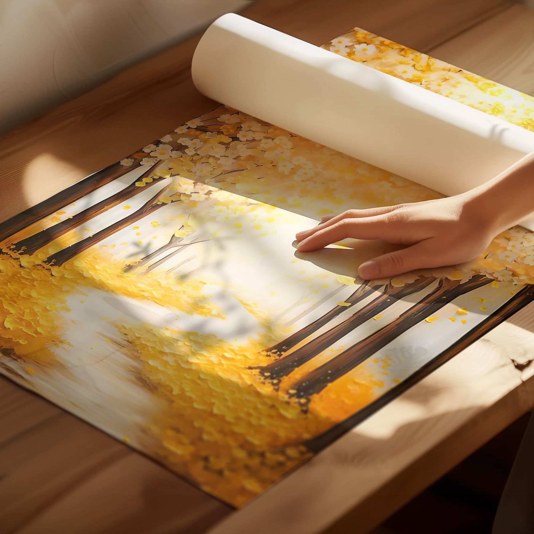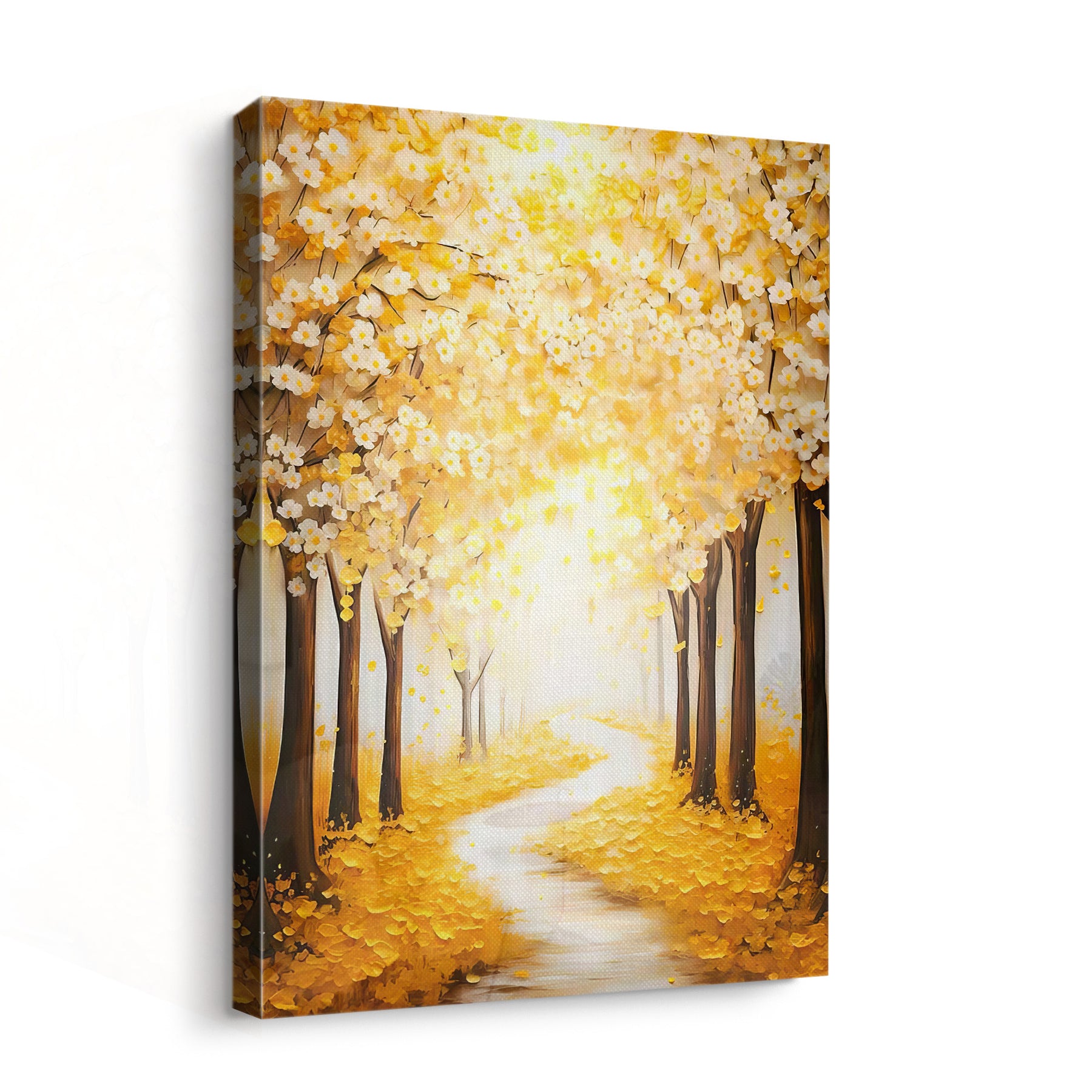 Bask in the warmth and serenity of this radiant tree-lined path bathed in gold. Symbolizing renewal, harmony, and vitality, this glowing canvas captures the magic of nature in bloom. A perfect centerpiece for peaceful, light-filled interiors.
