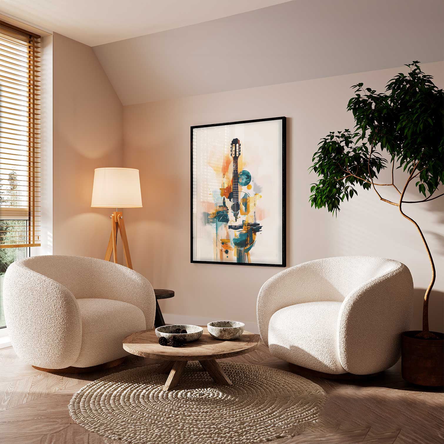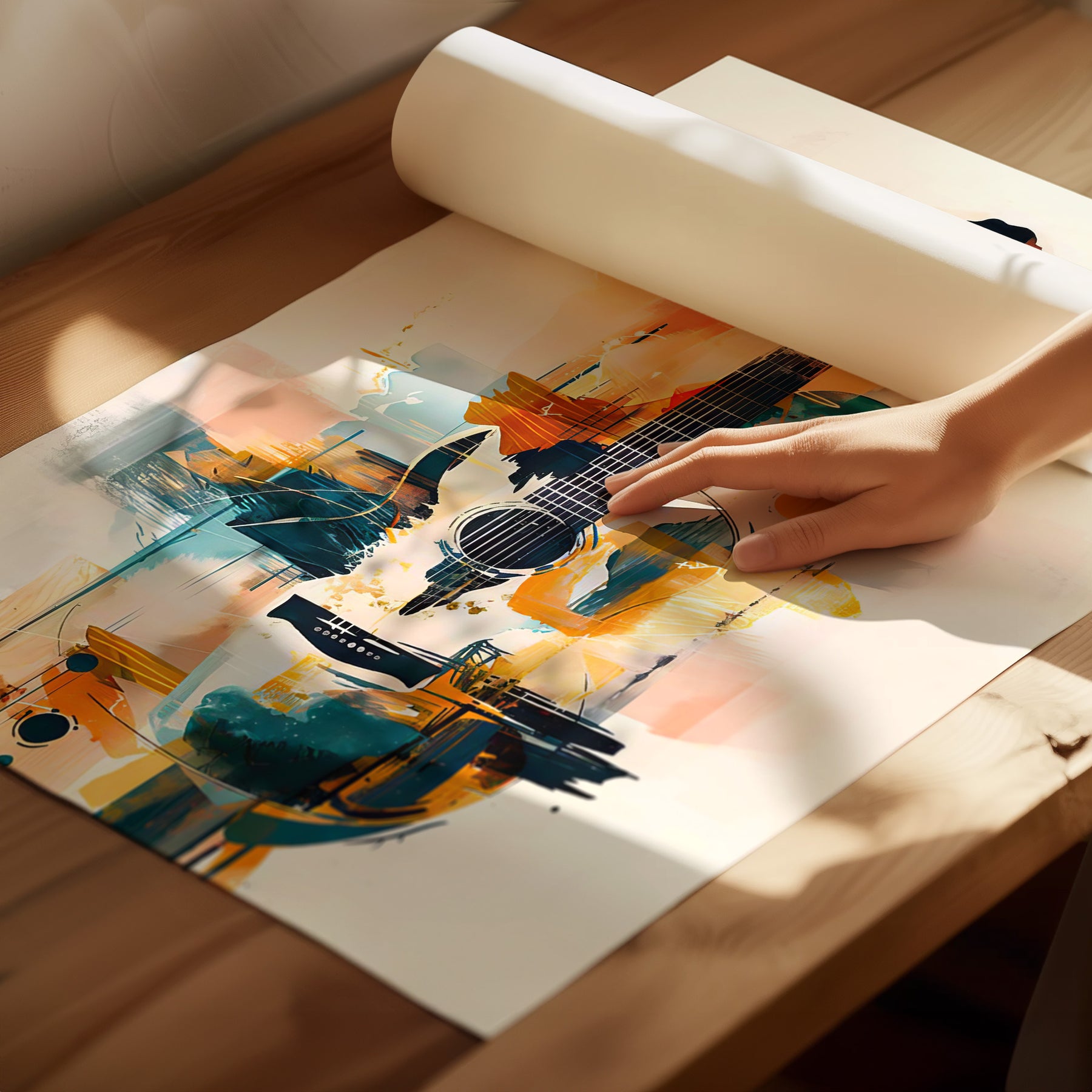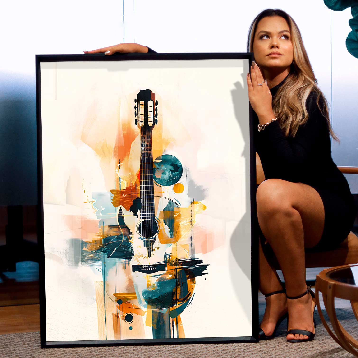 Celebrate rhythm and creativity with this vibrant Abstract Guitar Canvas. Designed for true music lovers, it blends bold brushstrokes, geometric shapes, and expressive color into a striking visual composition centered around an acoustic guitar. The fusion of teal, amber, and orange tones creates movement and warmth—perfect for studios, lounges, or any artistic space.
