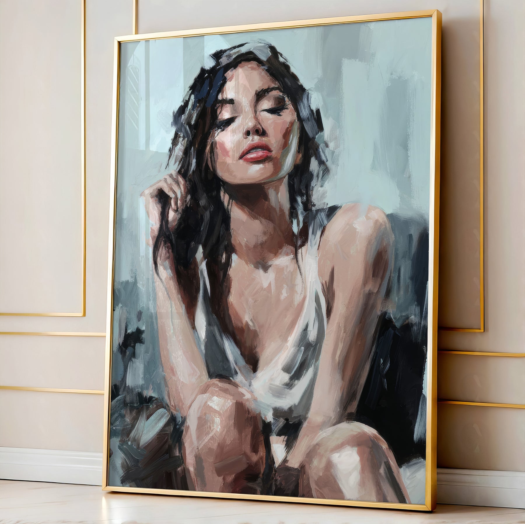 Bold yet intimate, this abstract portrait captures a woman in a moment of quiet confidence. Painted in broad brushstrokes and soft tones, her relaxed posture and closed eyes express calm self-assurance. A modern statement piece that adds emotion and elegance to any interior.