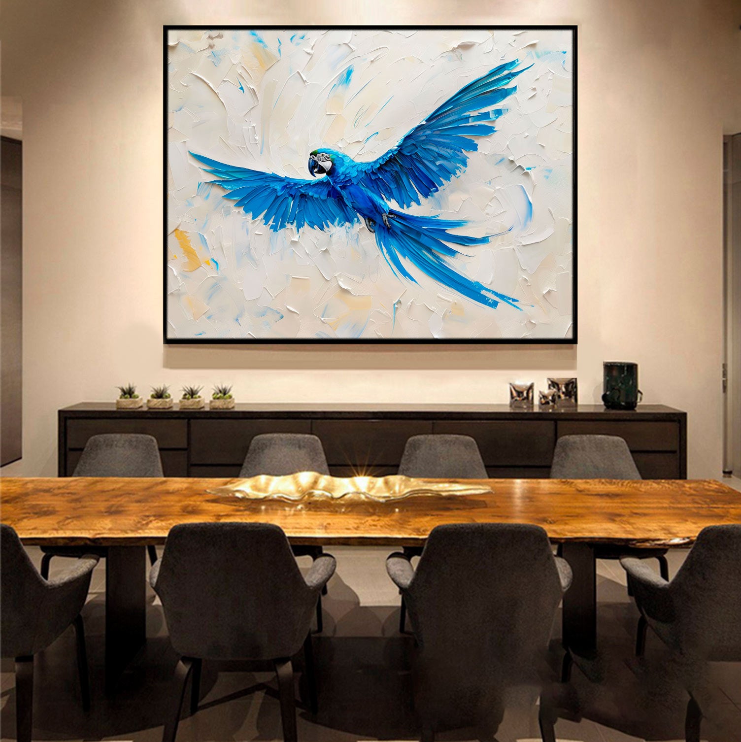 Bright, bold, and bursting with energy — this abstract canvas features a vivid blue macaw in flight, painted with sweeping strokes and rich texture. The creamy, pastel-toned background adds a modern, airy contrast to the intense tropical blue, making this piece a true eye-catcher. Perfect for contemporary interiors, creative studios, or nature-loving homes, it delivers elegance with a tropical twist.