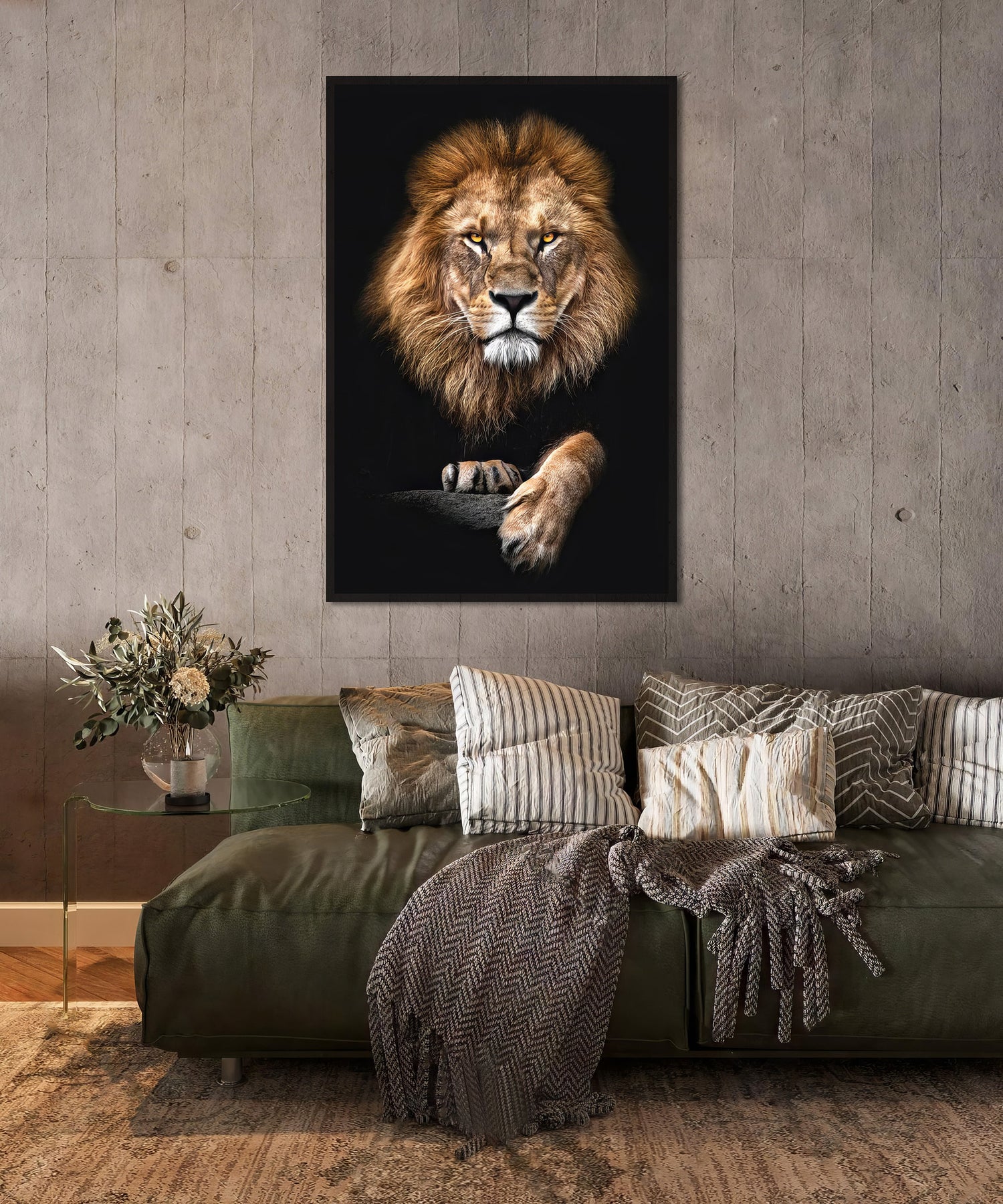 Intensity meets elegance in this powerful lion portrait set against a dramatic black background. Every detail—from the piercing golden gaze to the textured mane and poised paw—captures strength, confidence, and focus. This canvas is ideal for modern interiors, offices, or masculine spaces seeking bold symbolism and visual impact.
