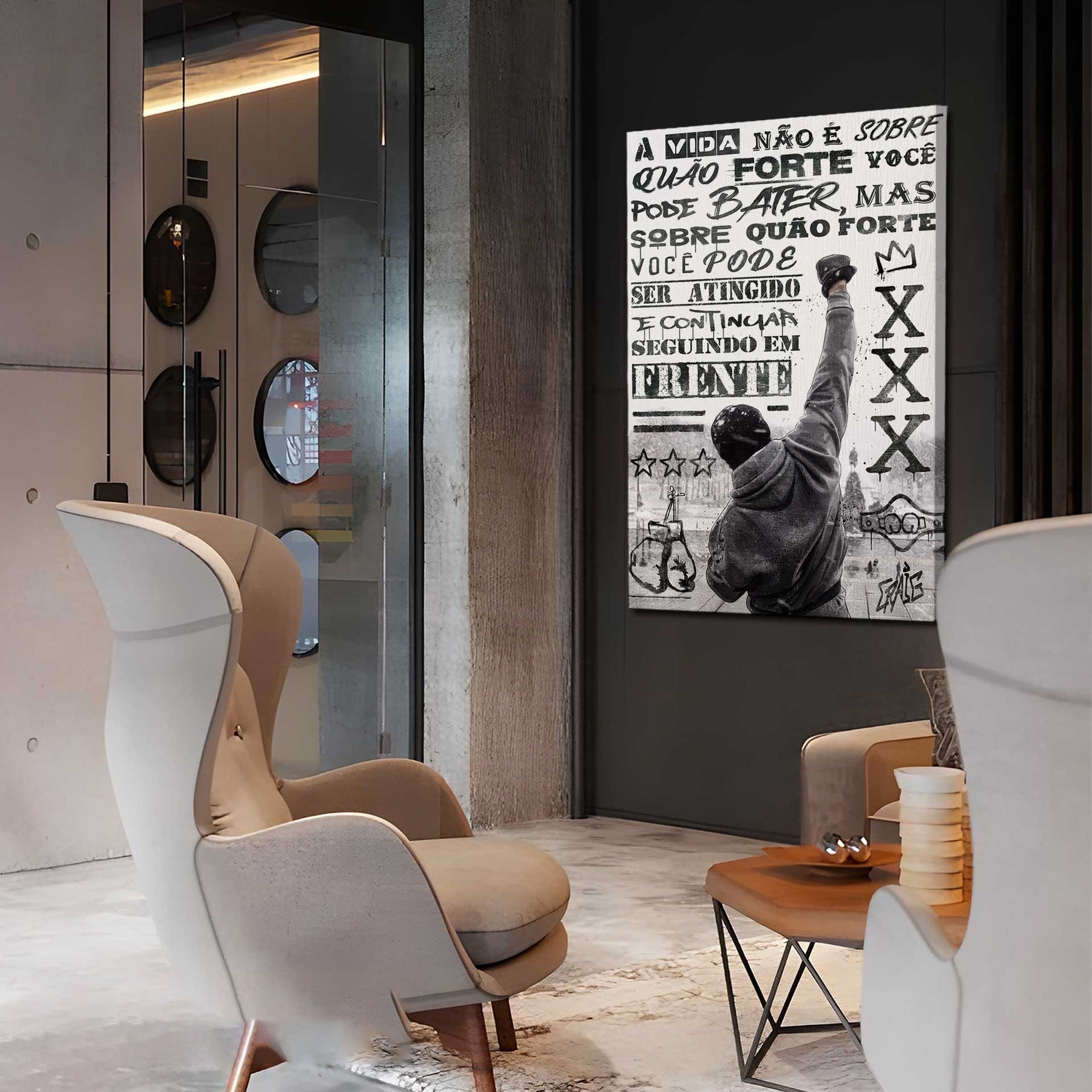 Channel resilience and raw determination with this gritty canvas tribute to the legendary underdog. Featuring a powerful graffiti-style design with Rocky’s iconic stance and an empowering Portuguese quote, this artwork reminds you that true strength lies in rising every time you fall. A striking piece for athletes, dreamers, and fighters of all kinds.