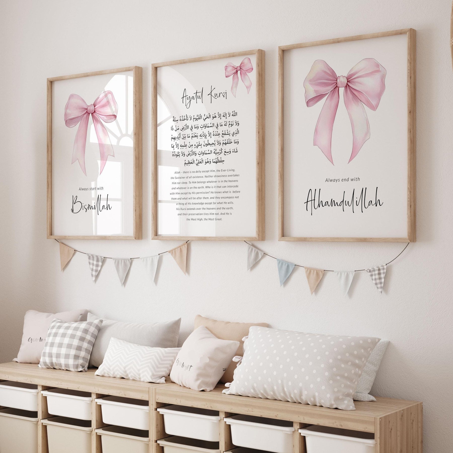 Bright, kid-friendly Islamic wall art designed for girls’ nurseries and bedrooms. This three-piece set features a delicate girly pink bow motif and Ayatul Kursi, offering a warm, inviting learning space.