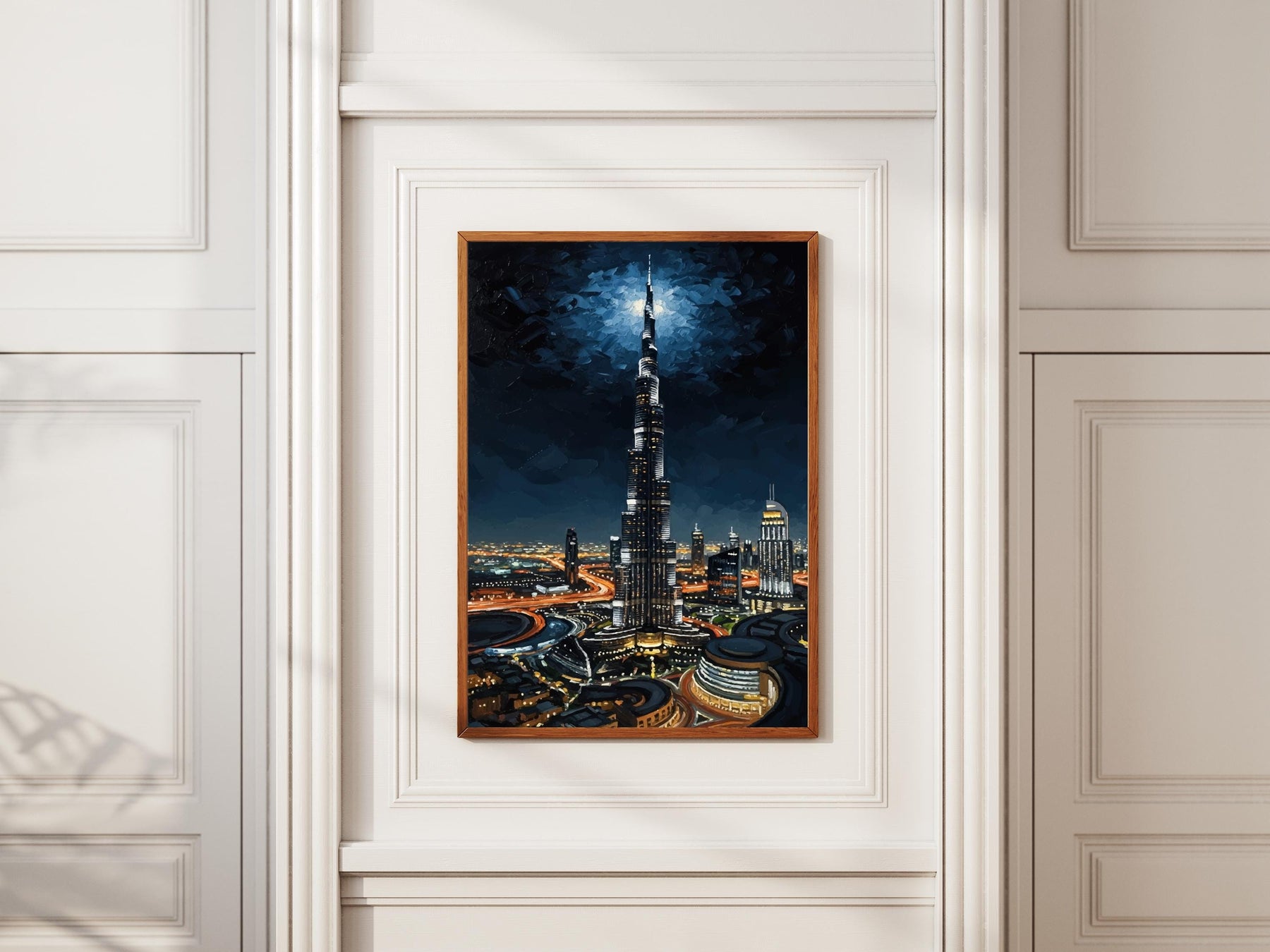 Capture Dubai’s iconic Burj Khalifa at night with this textured oil painting-inspired wall art print. A premium physical piece that adds moody luxury to living rooms, bedrooms, or office spaces.