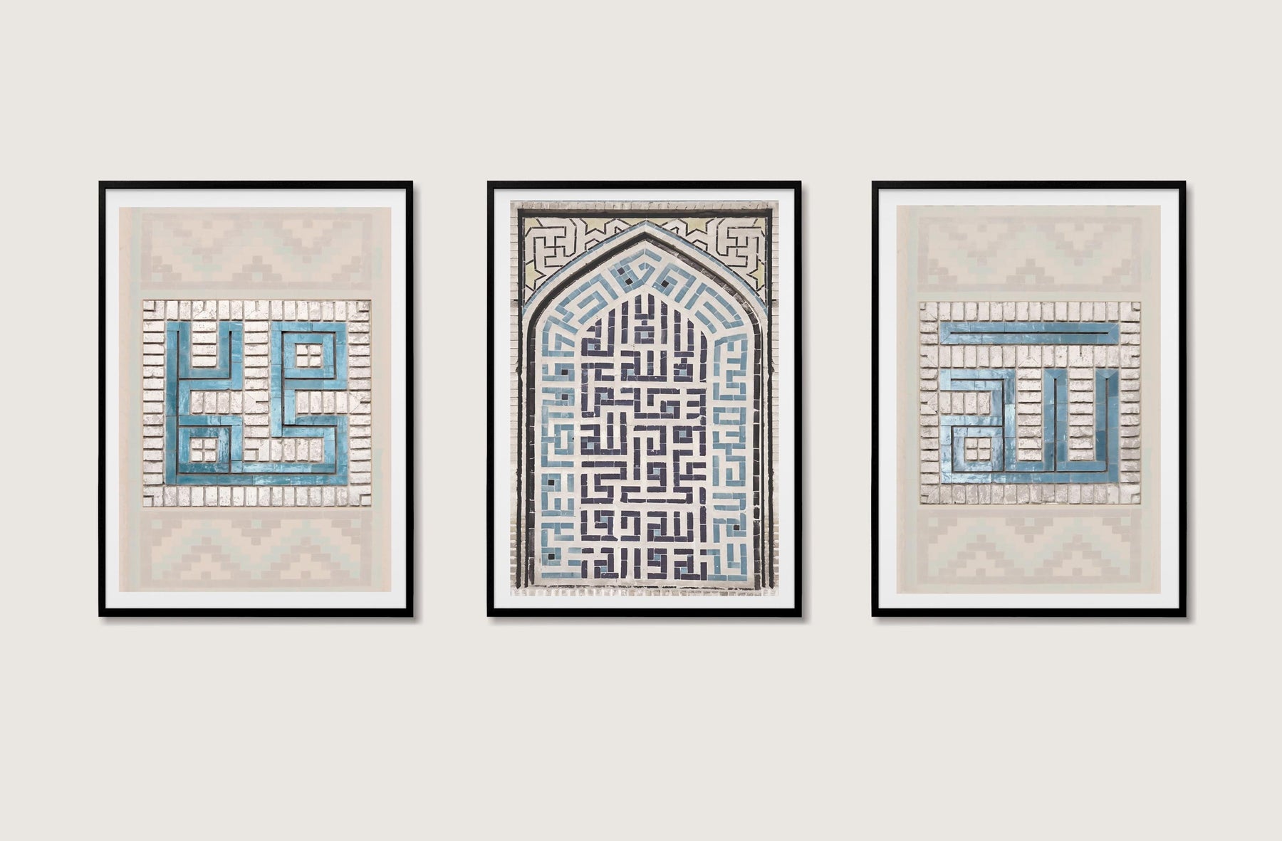 A premium three-piece Islamic wall art set designed to elevate spaces with reverent mosque architecture motifs.