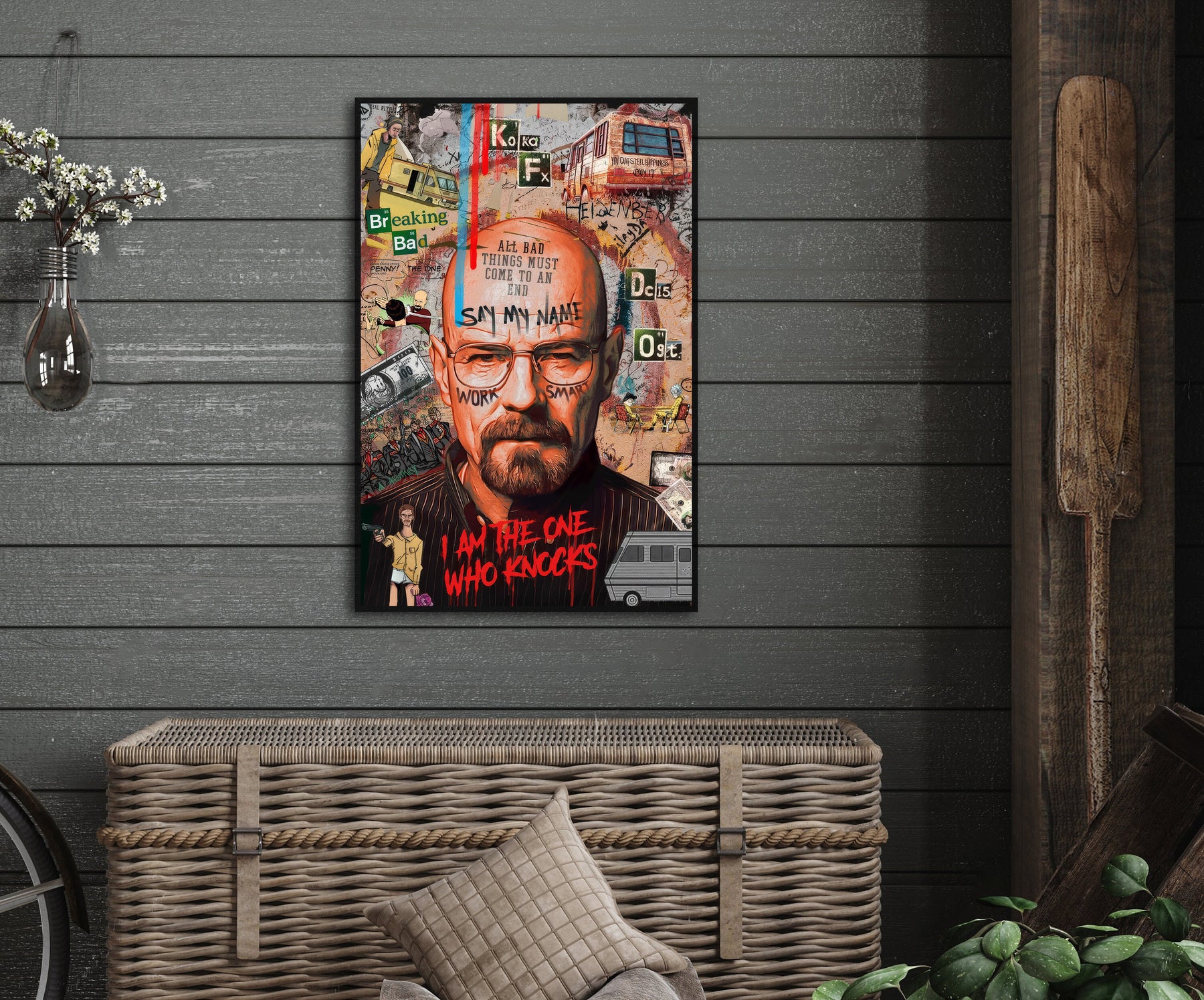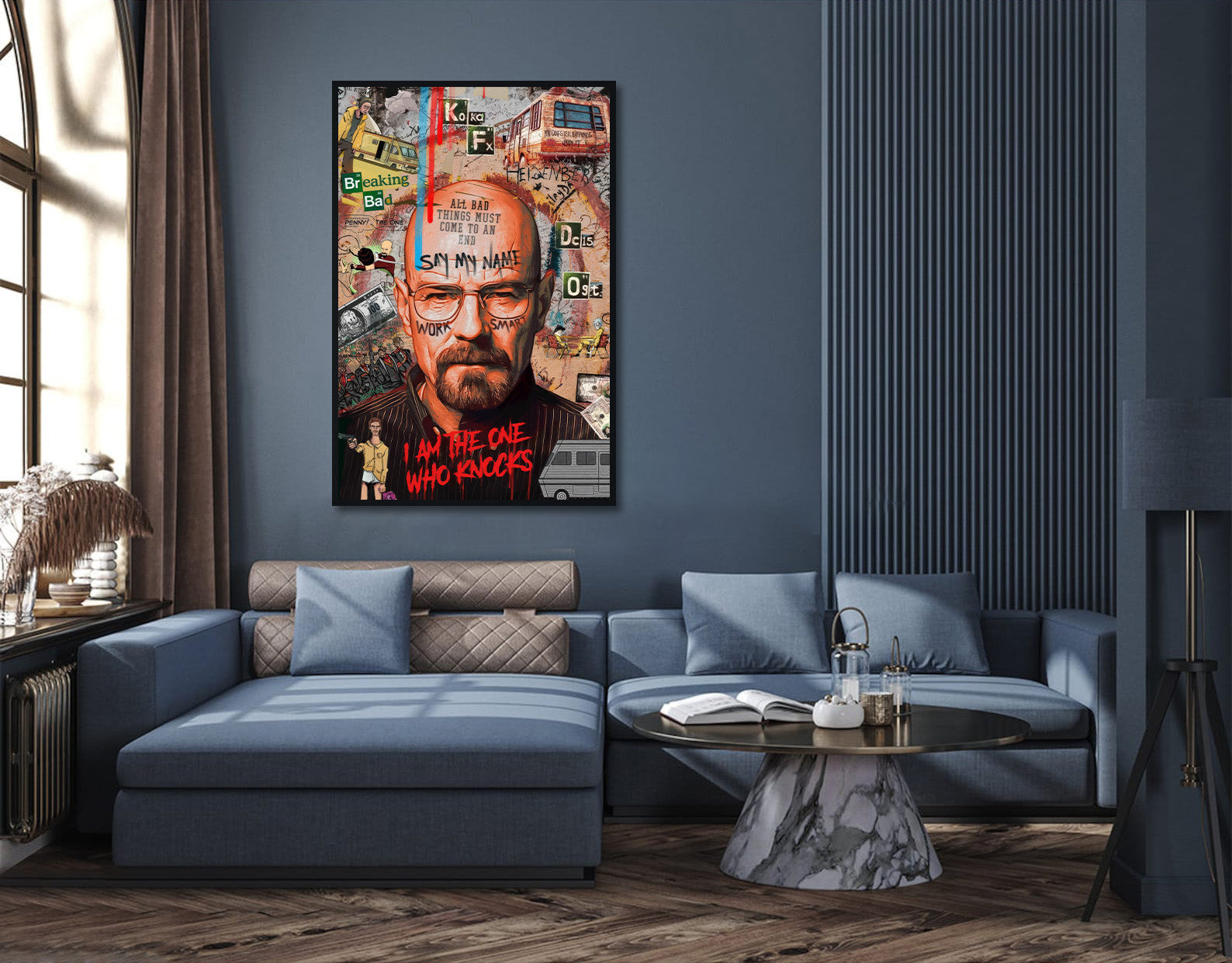 Step into the world of Walter White with this intense Breaking Bad canvas print. Featuring gritty collage-style art, iconic quotes like “Say My Name” and “I Am the One Who Knocks,” and layered visual references from the hit series, this bold artwork is a must-have for fans of TV’s most legendary anti-hero.