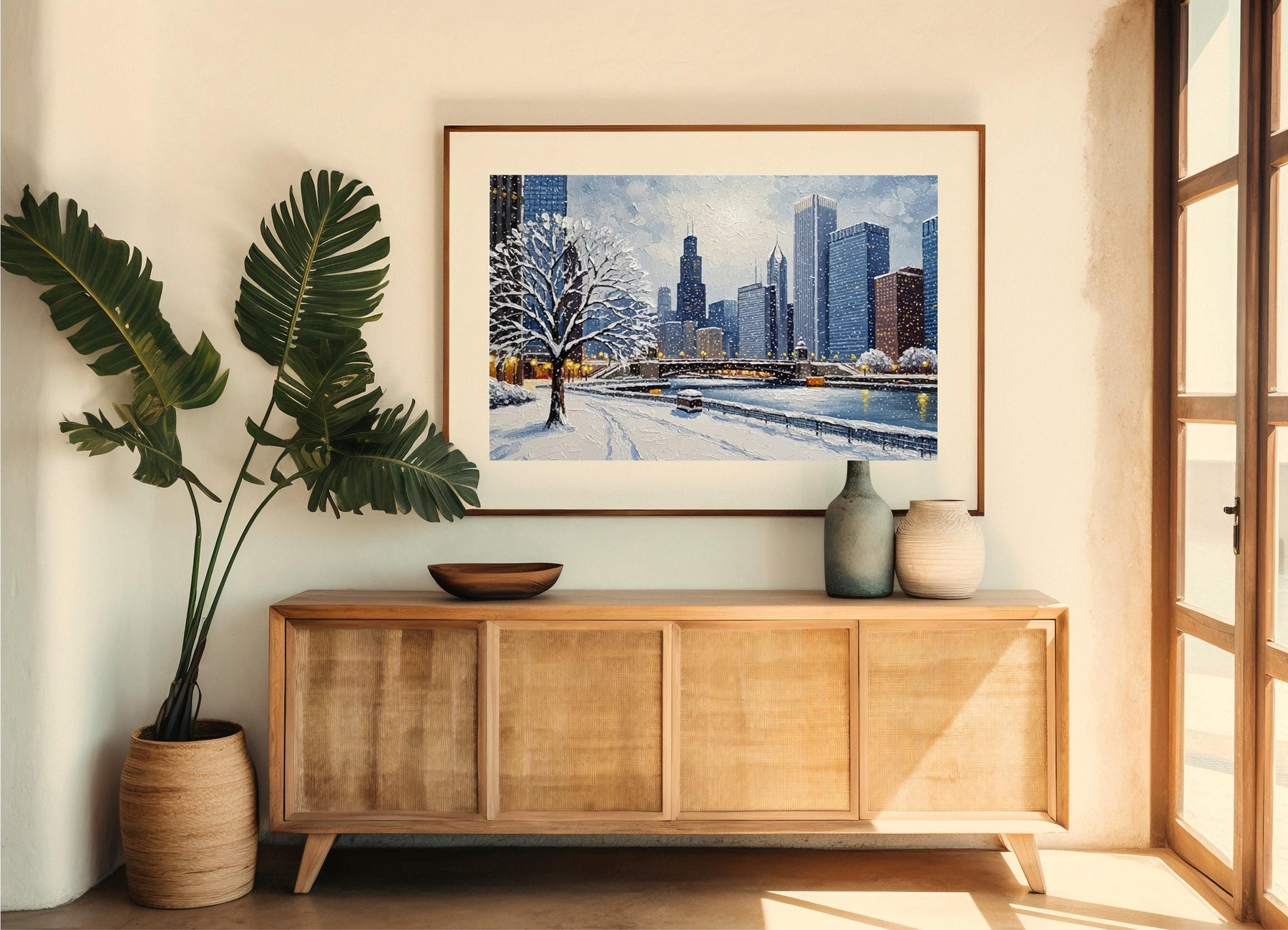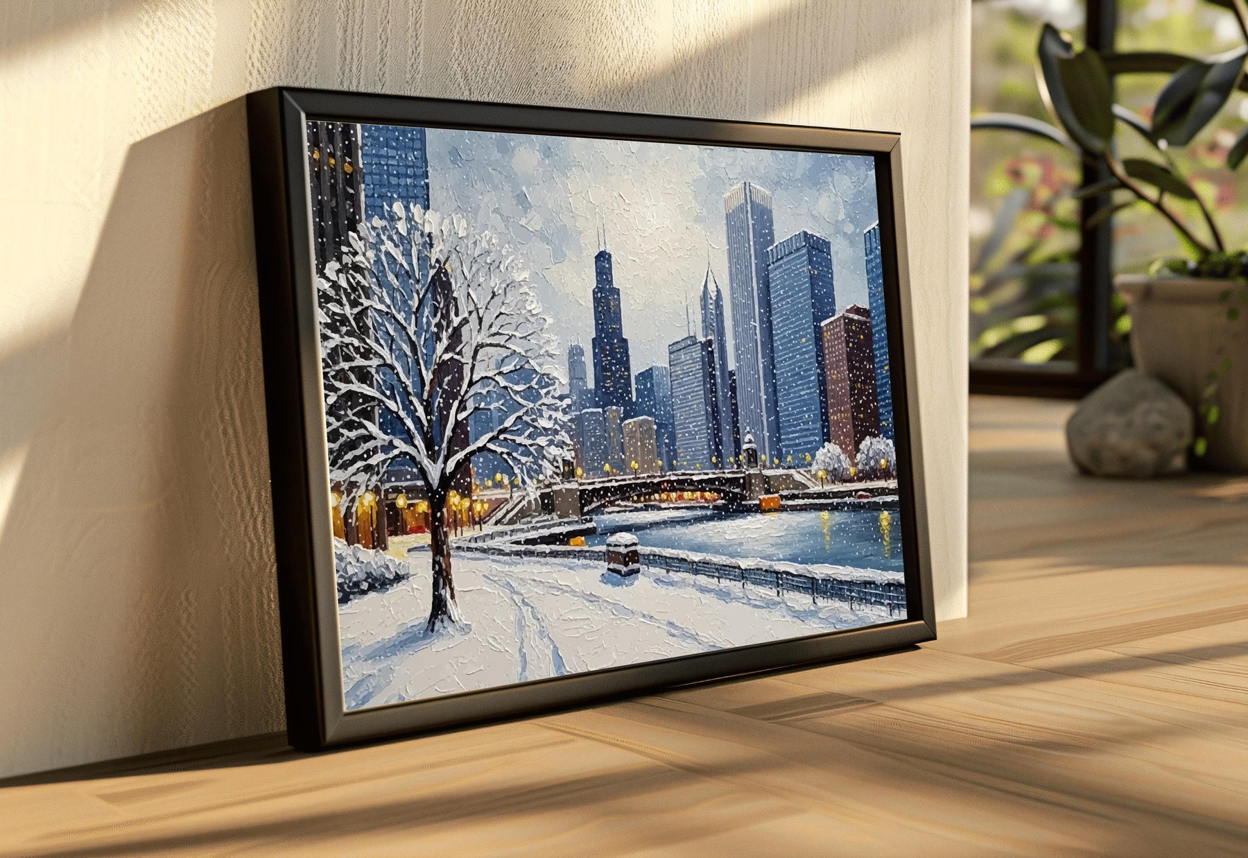 Elevate any room with a Chicago winter city scene printed as a premium wall art poster. The textured oil-painting finish captures frosted streets and the glow of downtown lights for a timeless, gallery-worthy look.