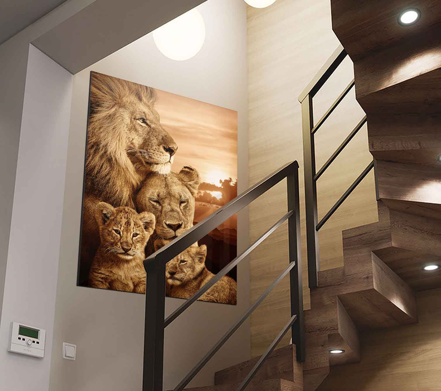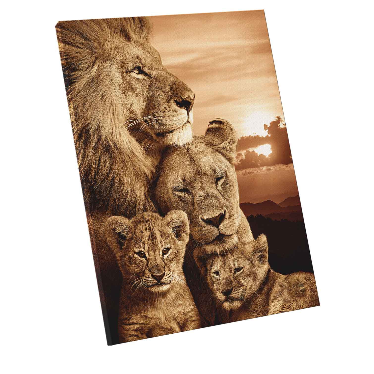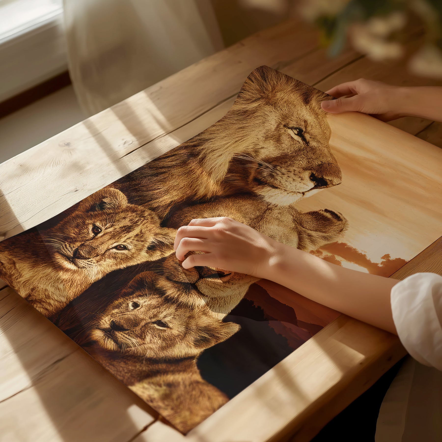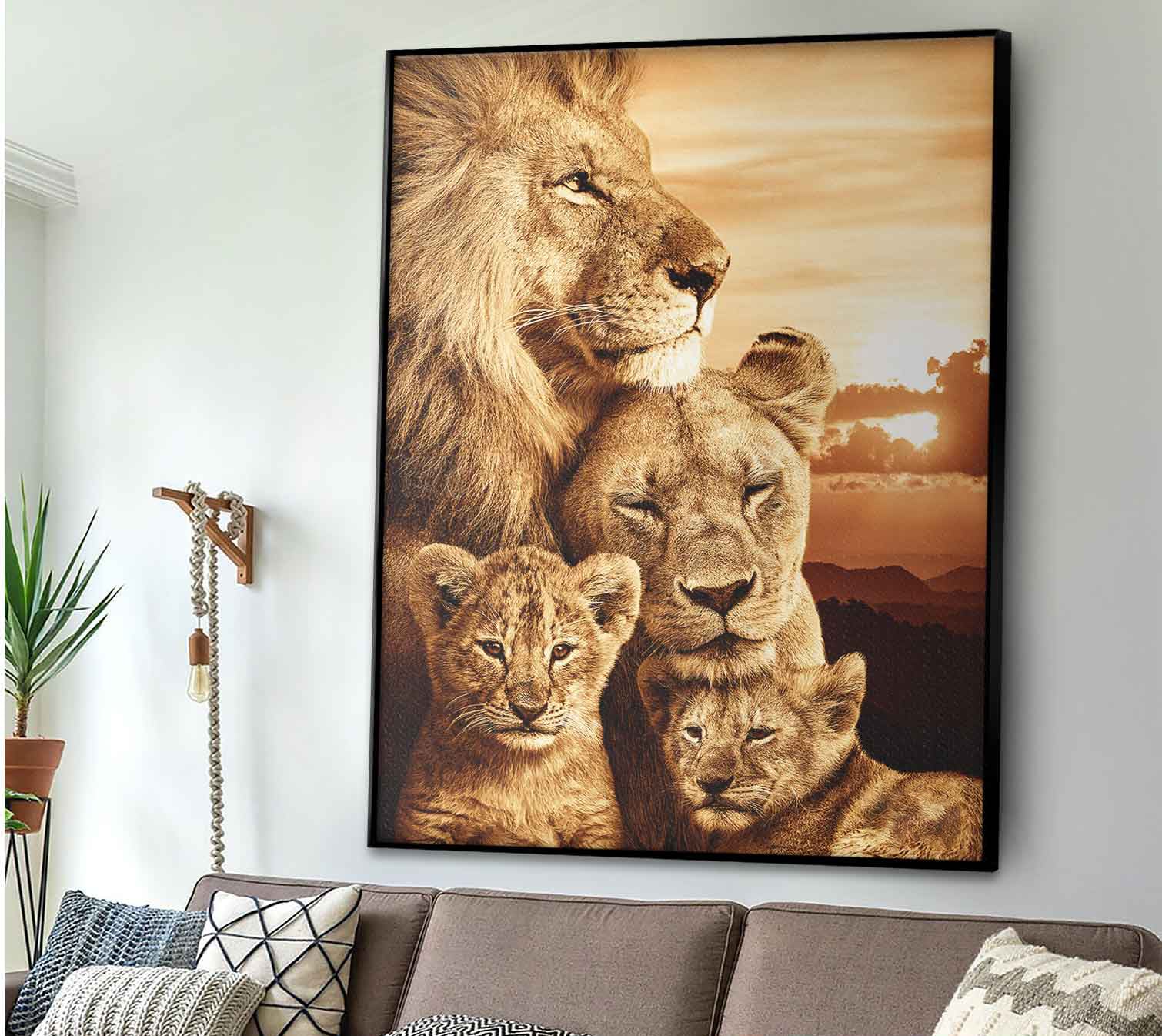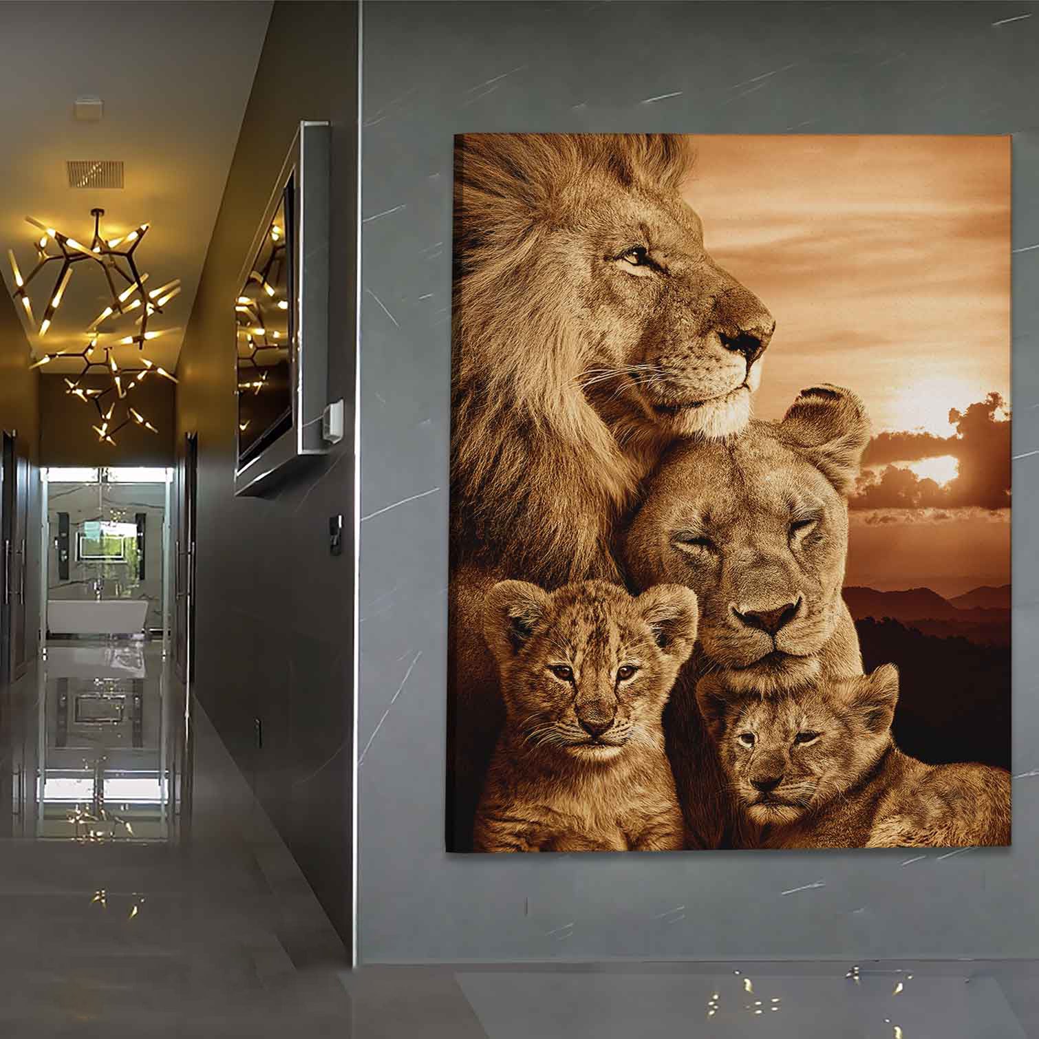 Experience the tender side of the wild with the Cozy Lion Family canvas print. This captivating artwork features a regal lion, his nurturing mate, and their relaxed cubs, all framed by a warm, golden sunset. Symbolizing unity, calm strength, and love, it's a soulful addition to any living space. Ideal for those who admire wildlife with heart.