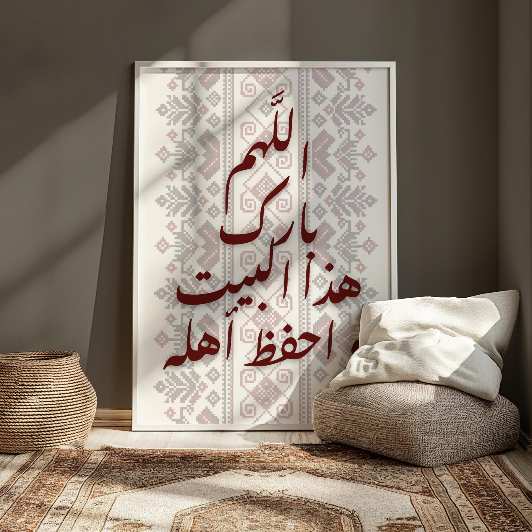 Bedroom decor with Arabic calligraphy artwork and Tatreez-inspired design