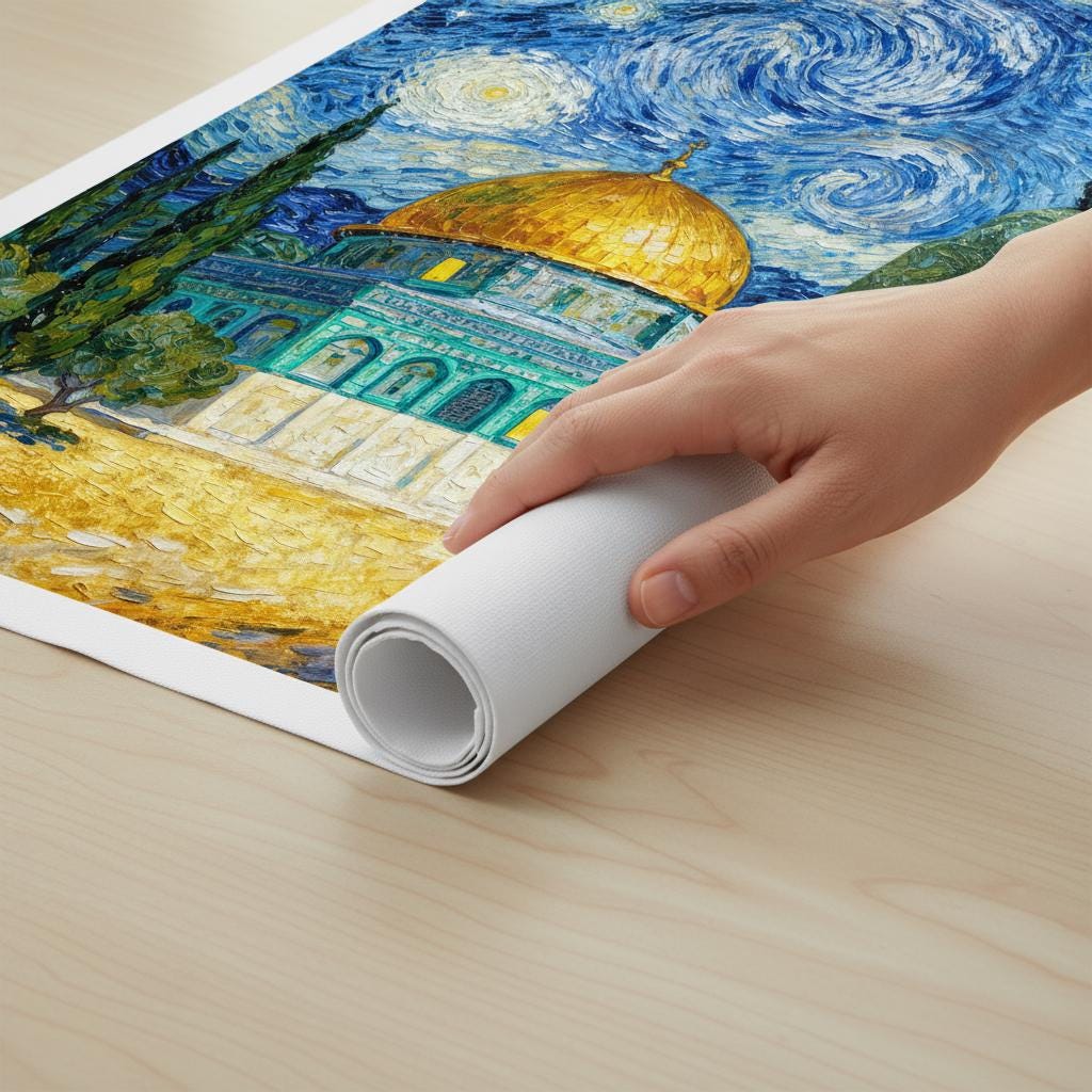 Elevate your space with a Palestine wall art piece featuring the Starry Night view of the Dome of the Rock in Jerusalem. Printed on premium archival canvas with fade-resistant inks for lasting color and sharp detail.