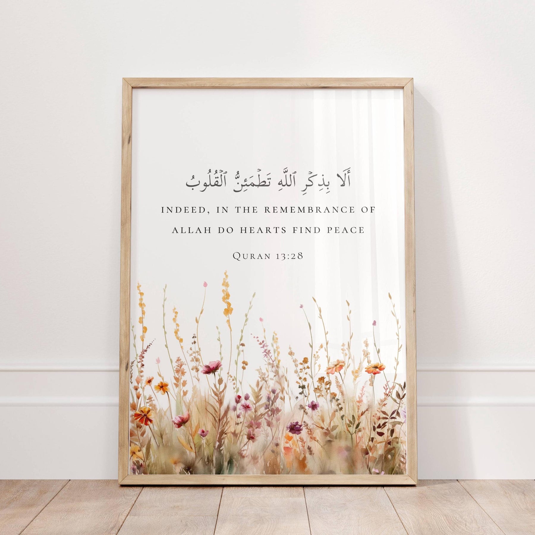 This Quran Verse 13:28 wall art features elegant Arabic calligraphy in a clean, minimalist layout. The design invites focus and reflection, making it a thoughtful addition to living rooms, bedrooms, or prayer corners.
