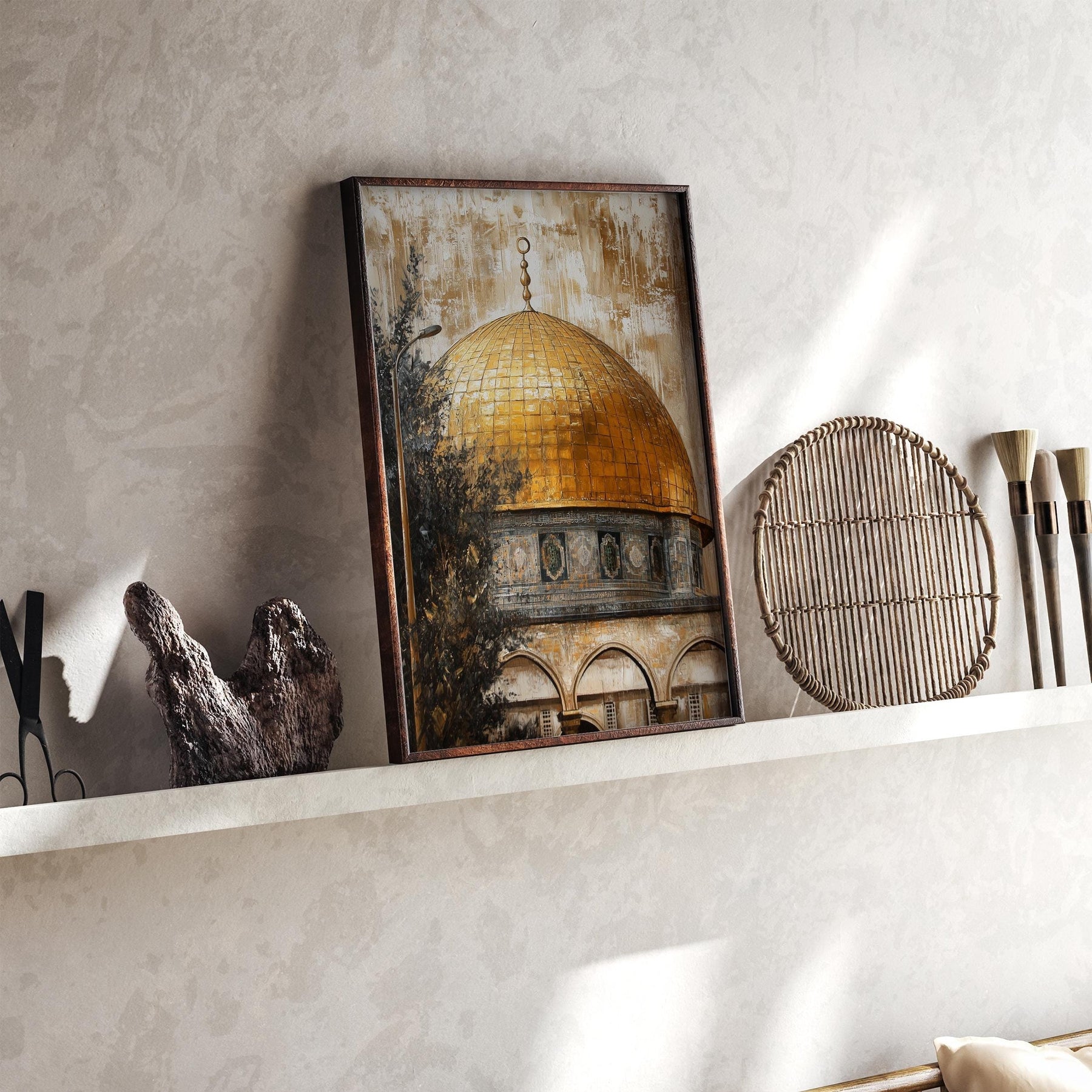 Elevate your space with a timeless portrayal of the Dome of the Rock, blending Palestine heritage with refined artistry. This Islamic wall art invites contemplation and adds warmth to living rooms, bedrooms, or study walls.