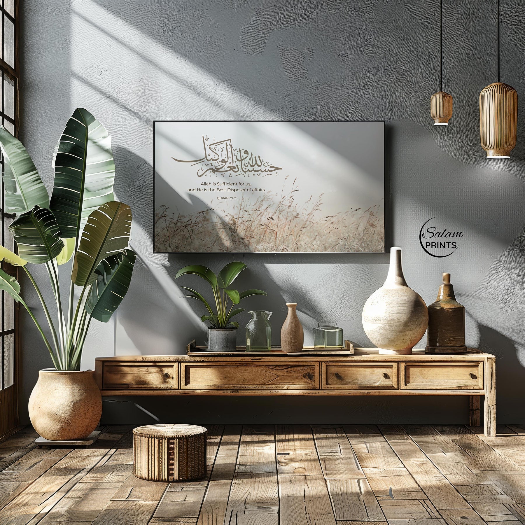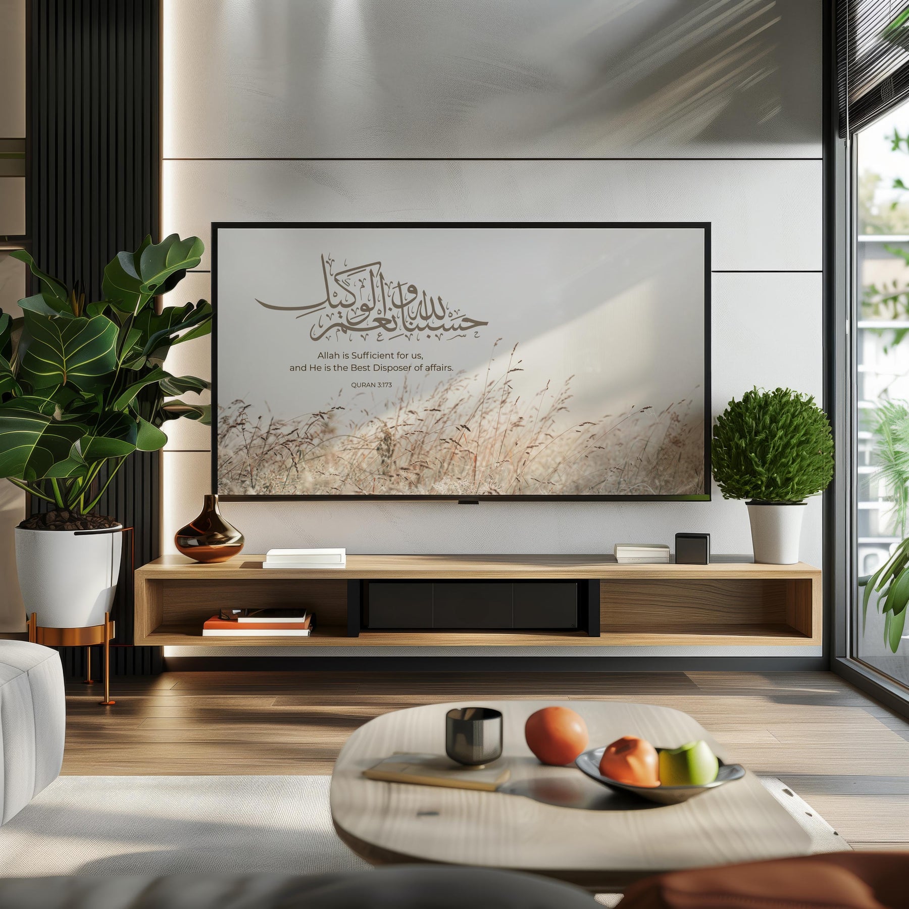 Elevate your living space with a minimalist Quran verse calligraphy wall art, designed to complement Samsung Frame TV setups and neutral home decor. The calm palette and refined typography make an elegant focal point in any living room, bedroom, or prayer corner.